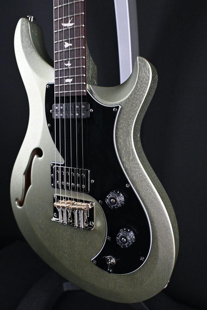 The pickguard-loaded electronics feature a PRS DS-01 pickup in the treble pickup position, providing a bright, punky tone, while the PRS Narrowfield in the bass pickup position gives the Vela some noteworthy bite. The coil-tap on the tone control allows the treble pickup to split to single coils, providing even more tonal versatility.